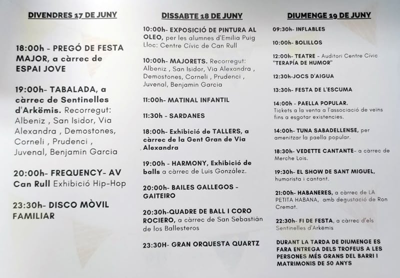 Aquest és el programa de la festa del barri, que comença divendres i s’allarga fins diumenge a la nit. Hi haurà dues cercaviles, una de tabals divendres a la tarda, i l’altra de majorets, dissabte al matí. Diumenge al migdia se celebrarà l’habitual, i multitudinària paella popular (14 hores). Abans, però, hi haurà festa de l’escuma (13.30 hores). La festa acabarà amb una actuació dels Sentinelles d’Arkëmis.