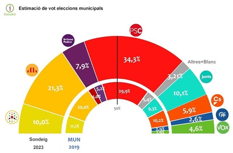 Foto portada: percentatge de vot segons el sondeig i segons els resultats de les municipals de l’any 2019.