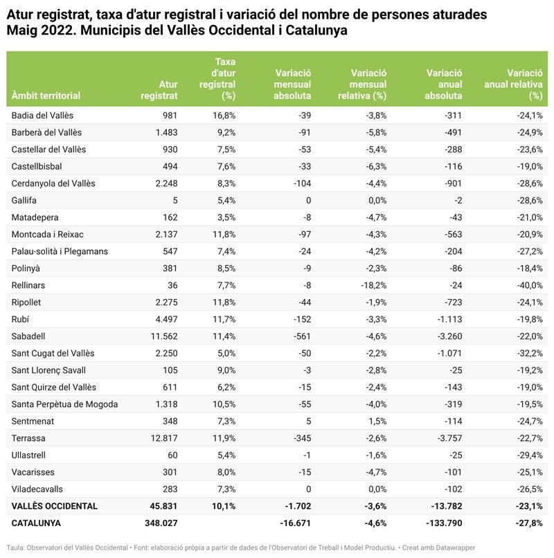 12 mesos després, les xifres són bones, gairebé històriques perquè situen el nivell de desocupació en un moment de boom pre-crisi. La d’aquest maig de 2022 és la xifra més baixa d’aturats des de juliol de l’any 2008. I per una vegada la davallada de l’atur ha estat especialment sensible a Sabadell, un municipi ja no gaire industrial sinó més bolcat als serveis. És el municipi del Vallès Occidental on més ha caigut l’atur amb diferència.