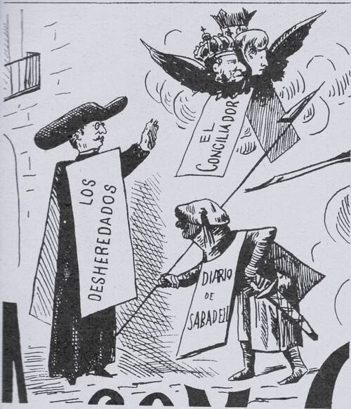 La primera publicació satírica esmentada per Puig és La Correspondencia De’n Nyoca (1880) un full imprès del que no s’ha conservat cap exemplar. Nyoca era un terme que popularitzà el periodista, Manuel Ribot i Serra, fundador de la conservadora Revista de Sabadell, per a referir-se càusticament a la ciutat. El 15 de juliol de 1882 va aparèixer Ja som cuatre, setmanari bilingüe, crític-satiric, amb redacció al carrer del Pedregar 27, imprès per Magí Ribera i on destaquen les caricatures del dibuixant Krup. La capçalera respon a que llavors es publicaven a la ciutat tres periòdics: Los Desheredados, El Conciliador i Diario de Sabadell, tots ells en castellà.