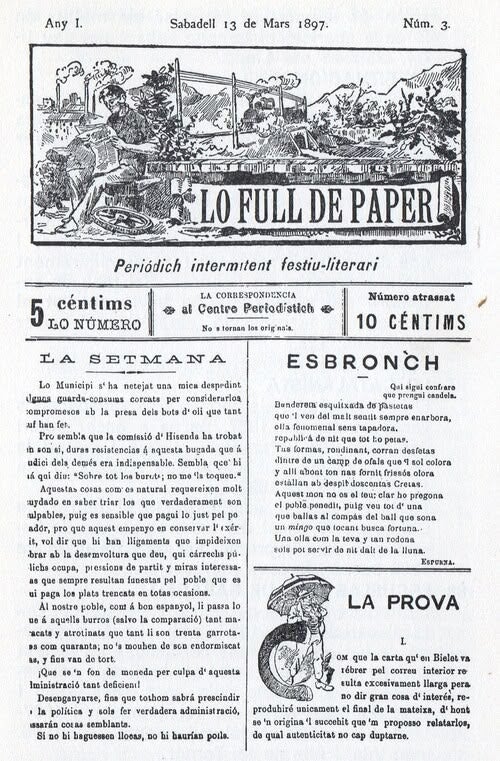 A aquesta publicació li feia la competència Lo Full de Paper, periòdic intermitent, festiu-literari, el primer número del qual aparegué el 27 de febrer de 1897, imprès per Magí Ribera. Aquí es publicaven articles satírics i literaris, així com crítica d’espectacles, la majoria sense signar o amb pseudònims dels quals Puig només a pogut identificar a Pere Martí i Peydró (Telesforo Pegadella).