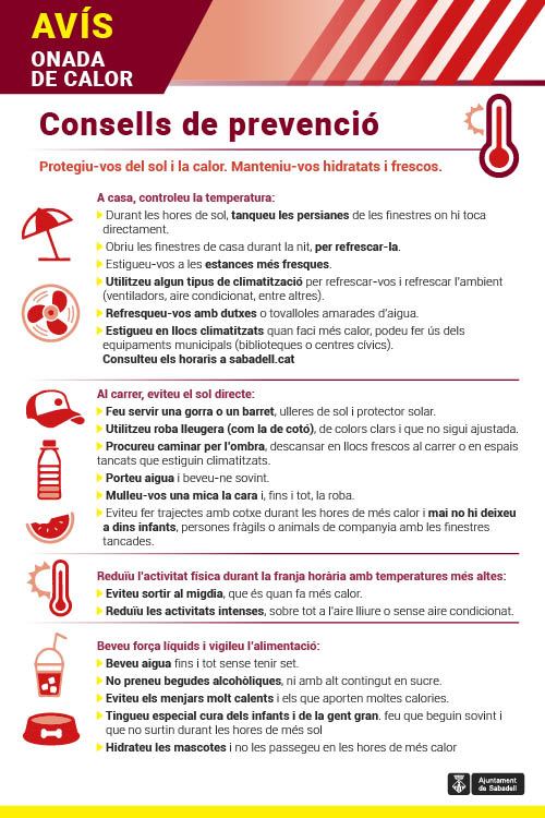 La previsió del temps és que aquest cap de setmana hi hagi un altre pic de calor i, davant de les altes temperatures, l’Ajuntament ha difós una bateria de consells preventius. Cal tenir en compte que nou dels 12 centres cívics estan oberts durant els dies laborables, però no els dissabtes i diumenges, i que a l’agost només obre una de les set biblioteques: la Vapor Badia (centre). Divendres la màxima s’enfilarà fins als 38 graus i davant dels riscos que això comporta el govern recorda que cal tenir molta prudència.
