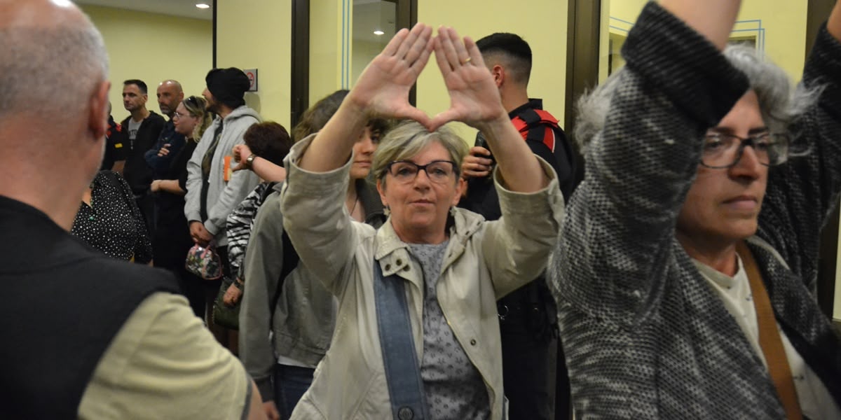 L’acte s’ha allargat prop de dues hores, amb crits cada cop que algú entrava o sortia de la sala. Les concentrades, una dotzena, han esperat a la porta. Passades les nou del vespre, i entre una àmplia presència policial, les participants a l’acte han sortit per un passadís entre les activistes i els agents de seguretat.