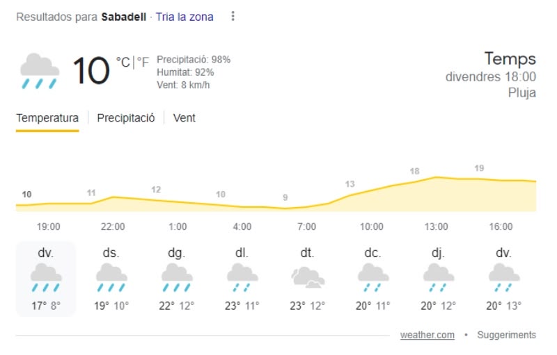 Protecció Civil de la Generalitat ha activat aquest migtdia el Pla Inuncat davant la previsió de pluges intenses, que no es poden descartar de nou en les properes hores. De fet, la web weather.com, molt utilitzada pels internautes, fa una predicción del temps per als propers dies ben diferent al que ha vingut succeïnt aquest any.