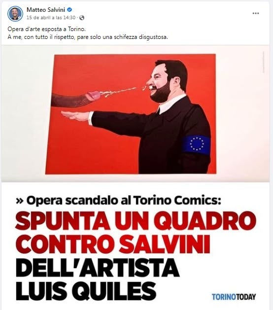 La imatge es va mostrar a la zona reservada als còmics eròtics i prohibits als menors de 18 anys de la 27ª edició de fira Torino Comics, a Torí, la principal fira de còmics del país transalpí, que atrau milers de visitants. Es va celebrar entre el 14 i el 16 d’abril. El sabadellenc Quiles presentava l’exposició Proibito. Però va causar gran polèmica. Salvini braç dret en alt. Salutació romana (iconografia feixista). Amb un braçalet de la Unió Europea al braç esquerre. I enfrontat a un penis negre de dimensions colossals ejaculant en el seu rostre, en concret en el seu bigoti.
