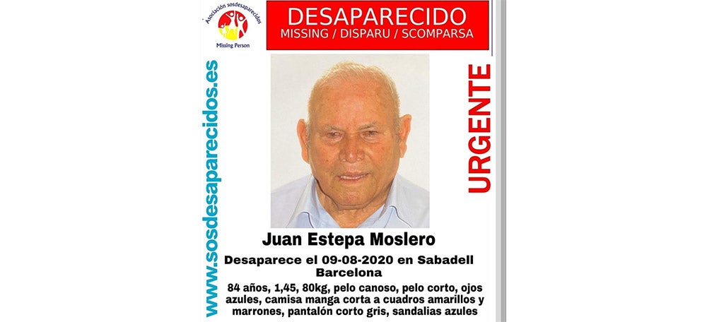 L’associació SOS Desaparecidos va denunciar dilluns a la tarda la desaparició d’un home de Sabadell. Es diu Juan Estepa, veí del barri de Sant Julià, té 84 anys i medeix no arriba a un metre i mig. L’home té el cabell curt, ulls blaus, camisa de màniga curta de color groc i marró i sandàlies de color blau. Estepa va ser vist per darrera aquest diumenge a la tarda. L’home conduïa el seu cotxe, una Renault Kangoo.